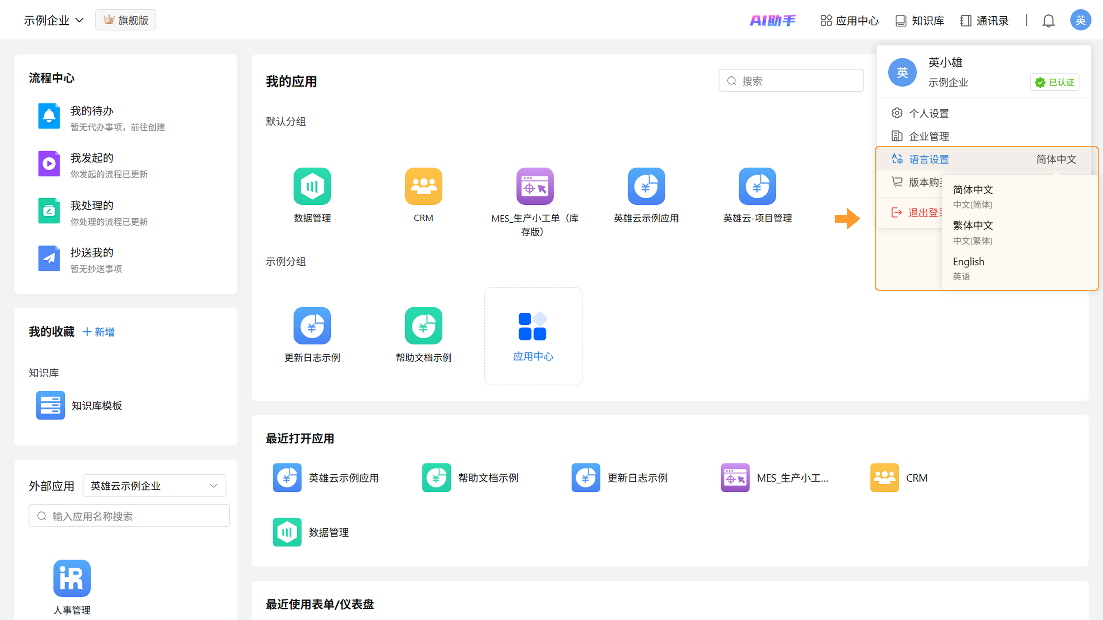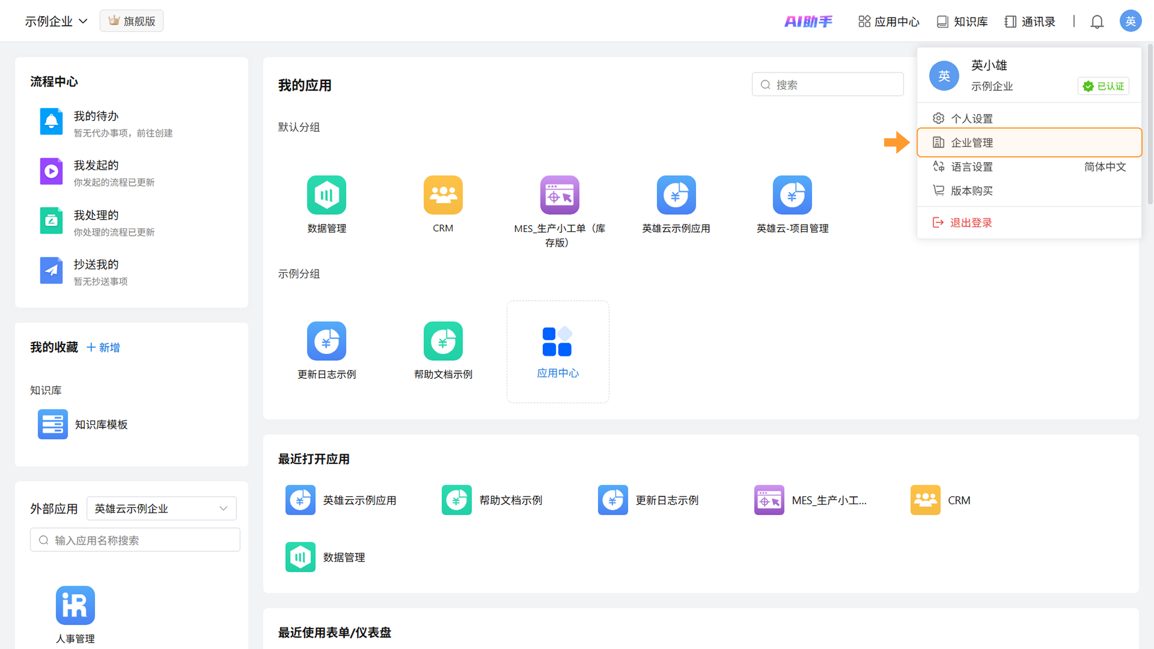 工作台是英雄云系统首页,也是所有功能模块的核心入口。企业成员可通过工作台,快速进入各模块、处理事务,便捷使用平台所有服务。