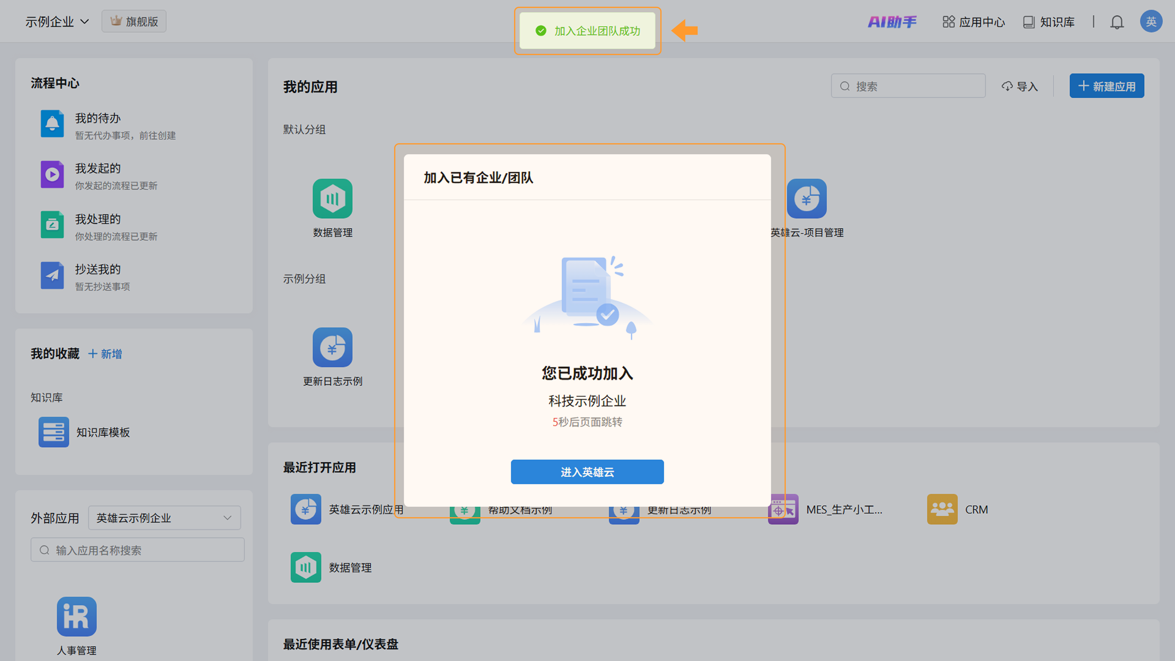加入企业/团队:点击弹窗中的「立即加入」,输入企业公开邀请链接,再点一次「立即加入」即可接受邀请;加入成功后,系统提示“加入企业/团队成功”,5秒后自动跳转至该企业工作台。