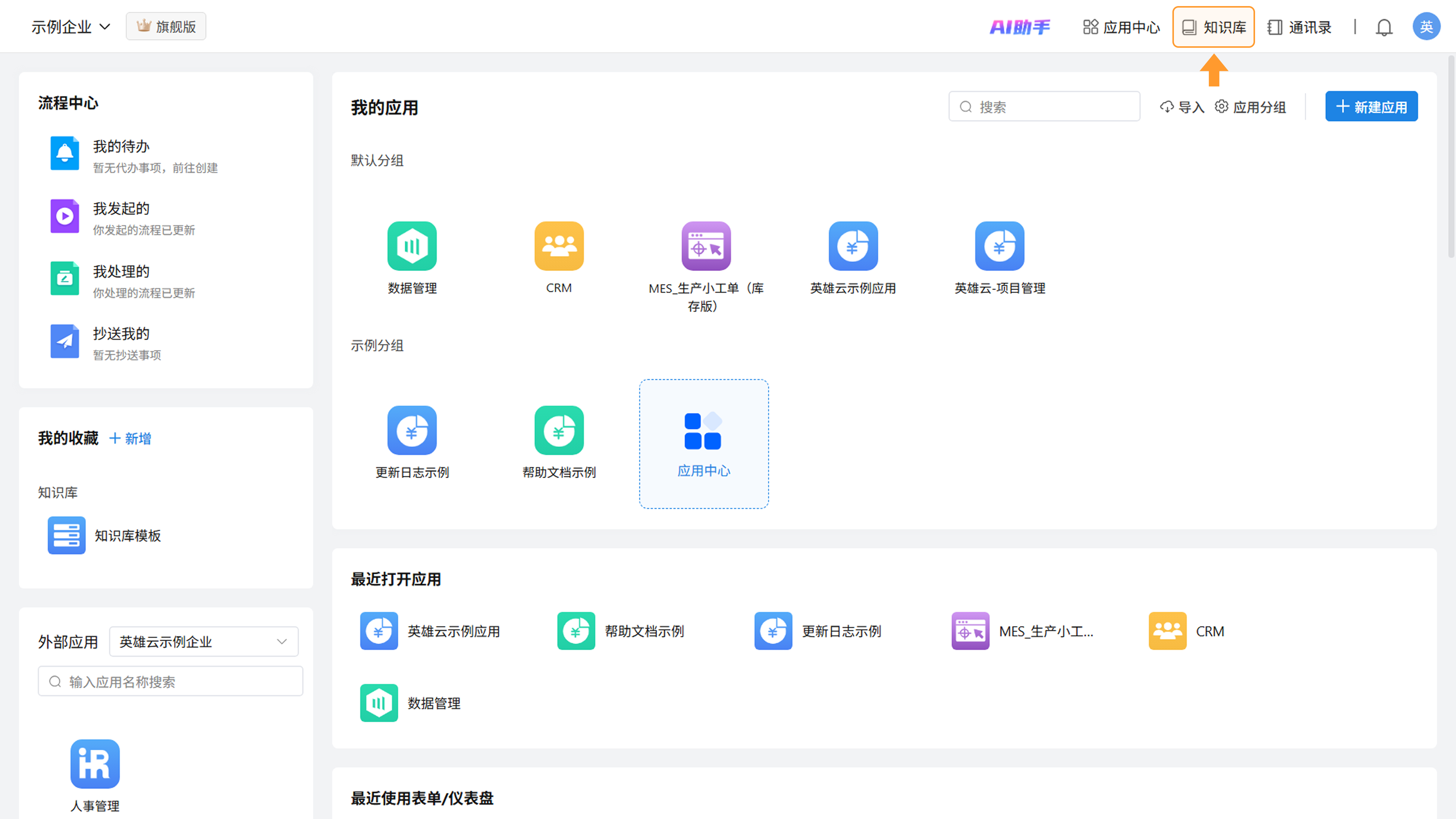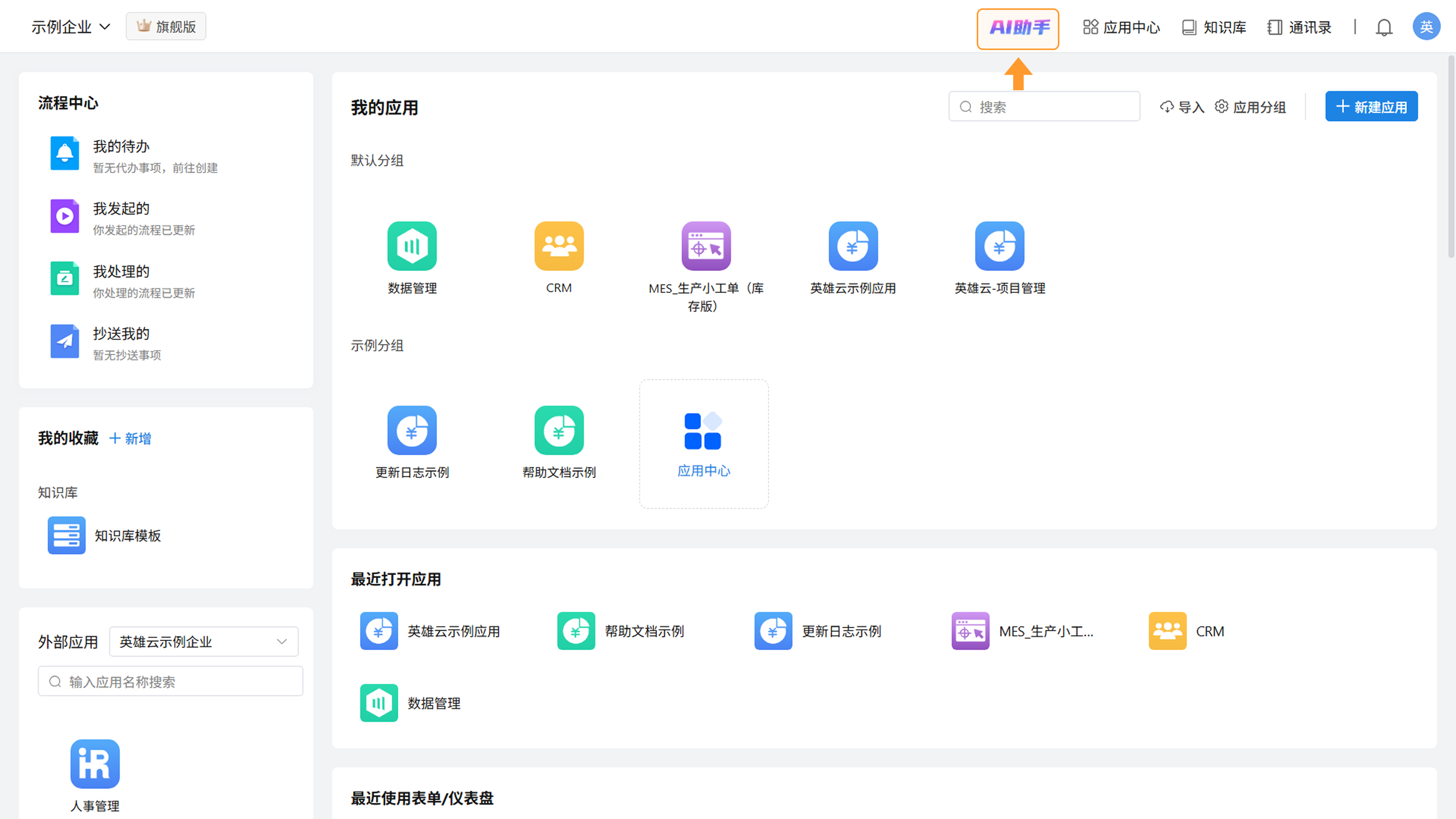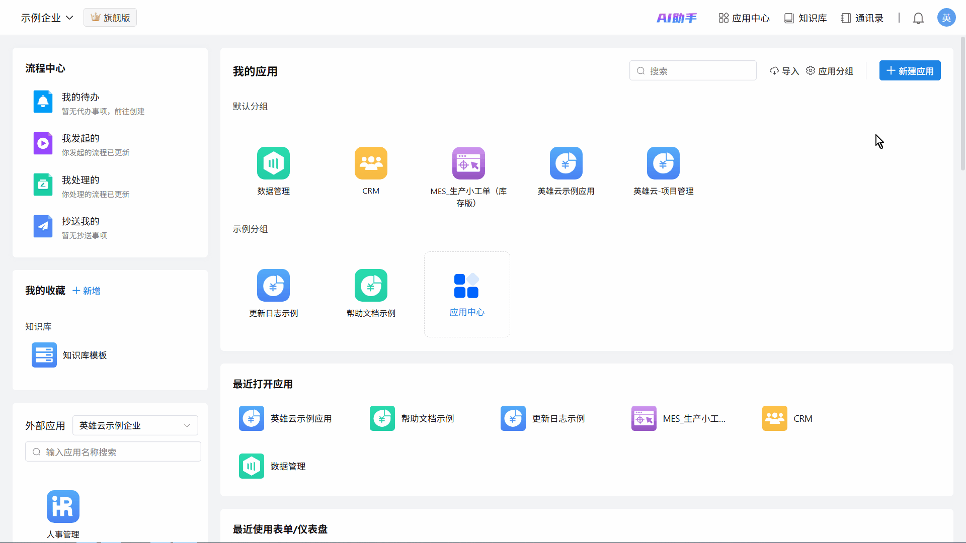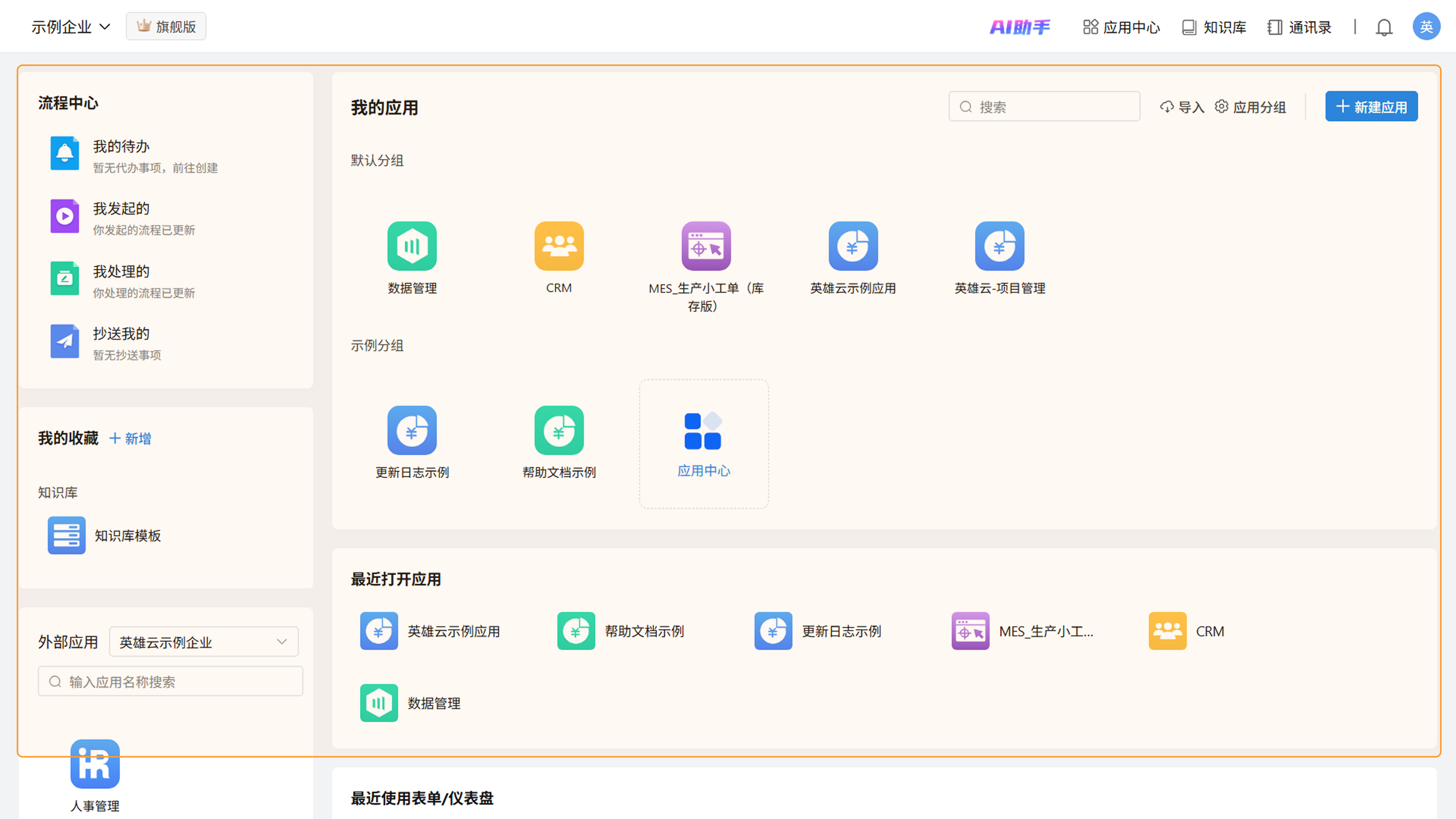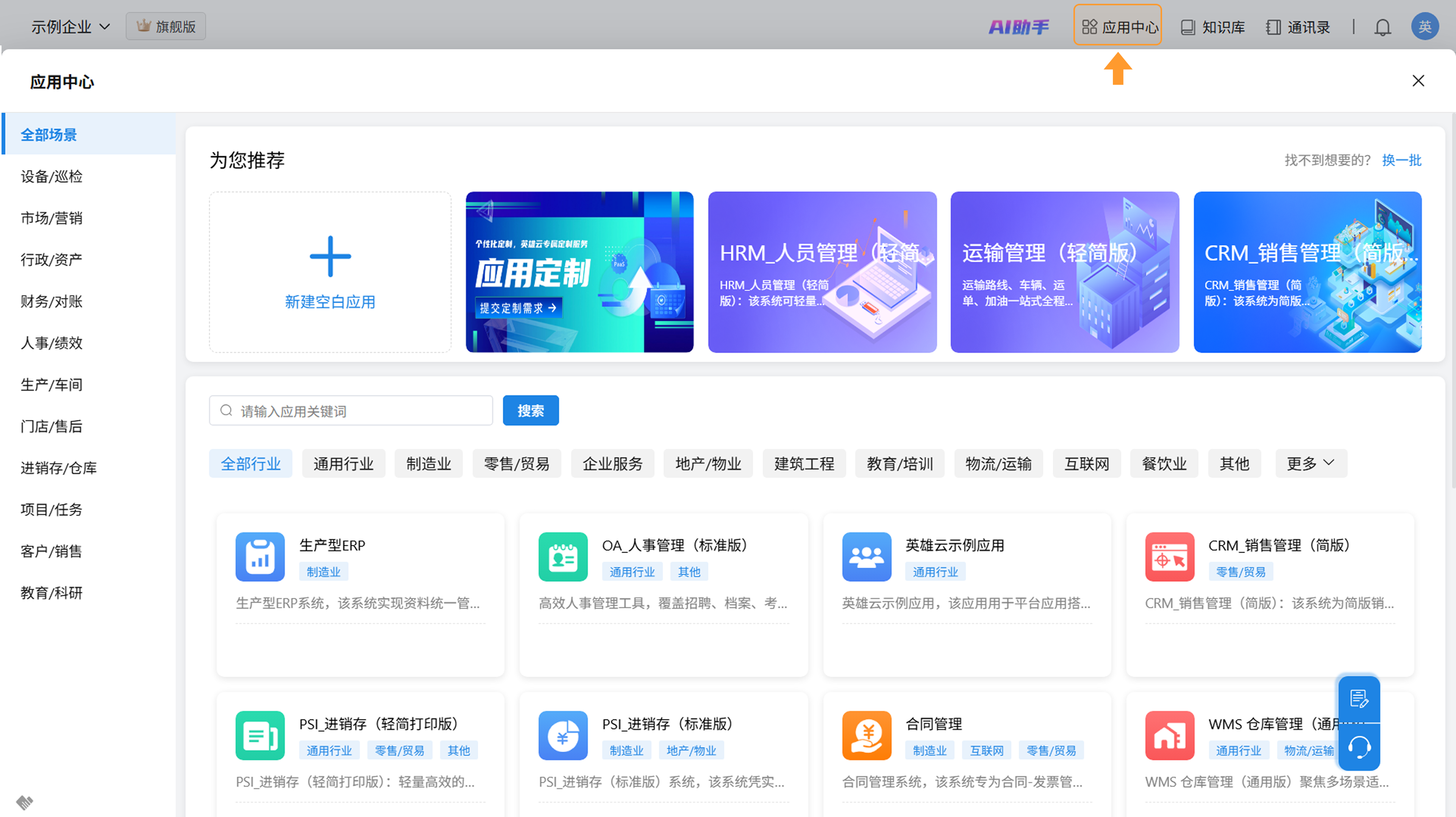 点击工作台顶部Tab栏的「应用中心」,即可进入英雄云的应用中心页面。用户可在此创建空白应用、安装应用模板或进行应用定制。