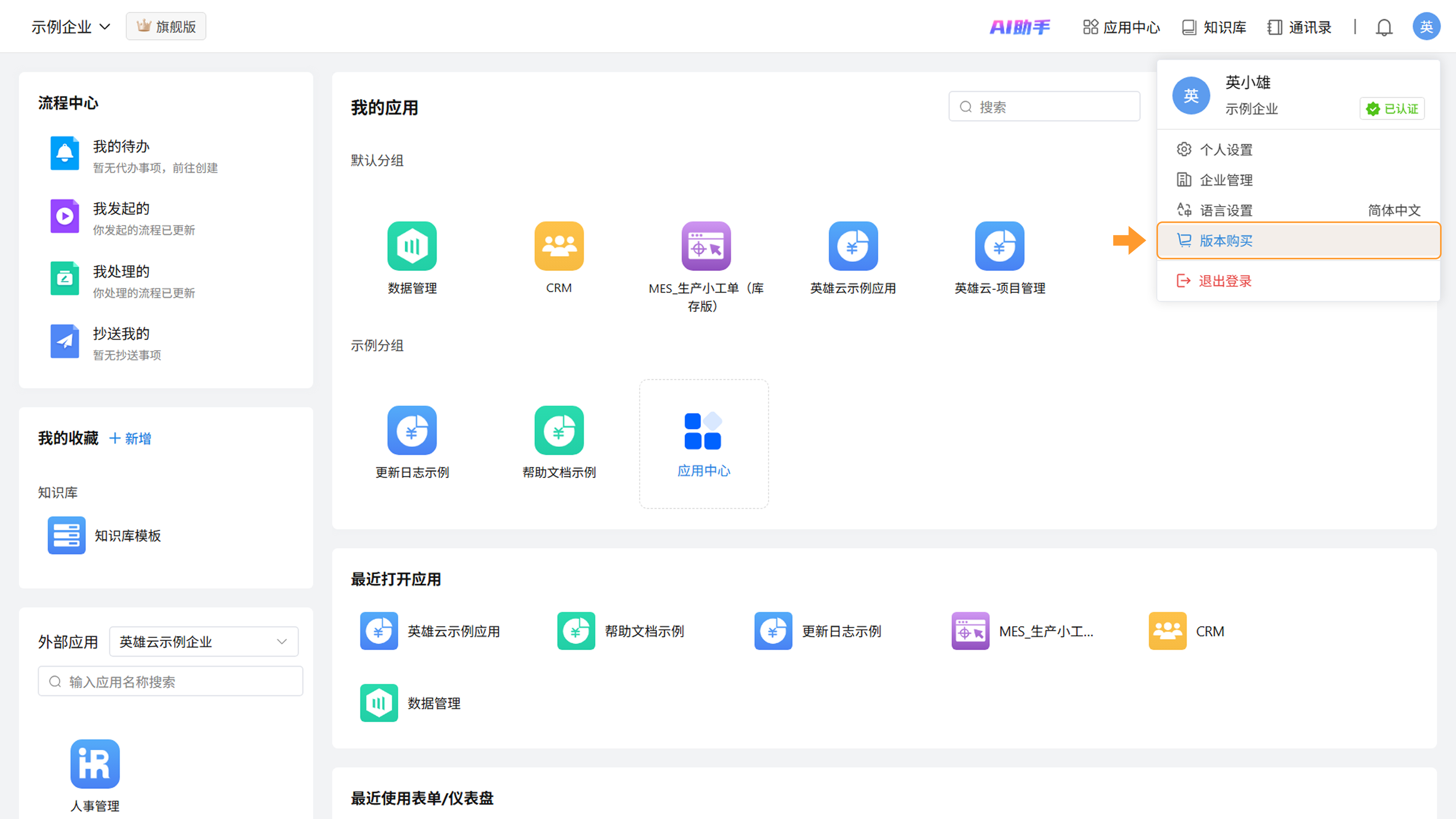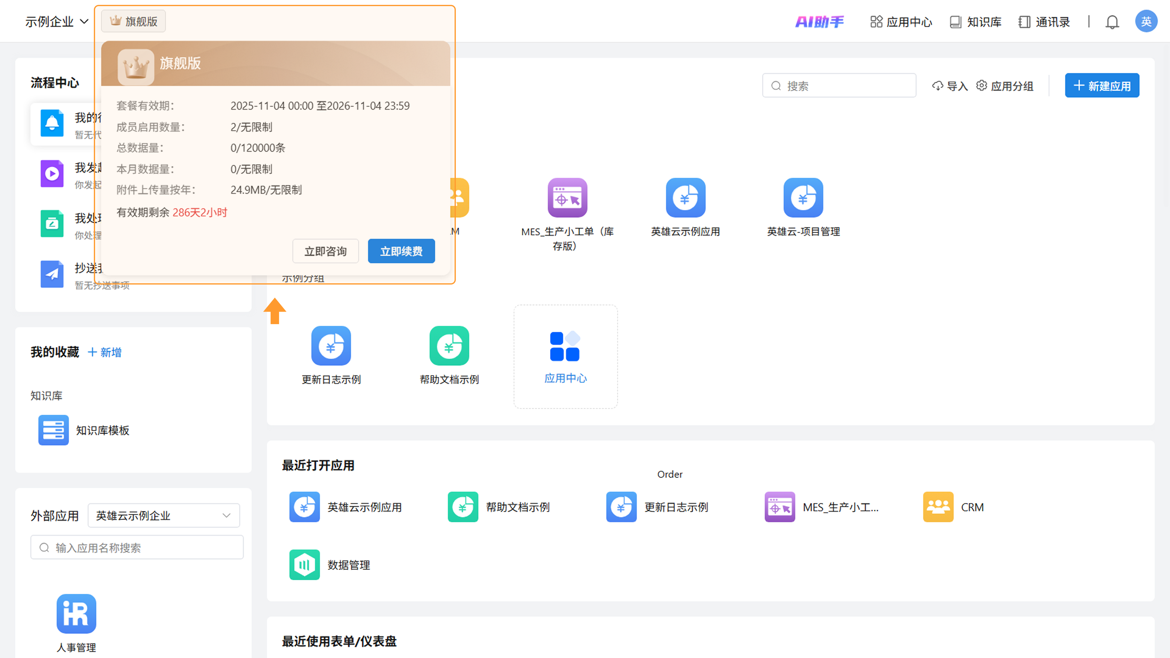 英雄云工作台提供企业版本信息查询功能,点击工作台左上角「套餐」图标,可实时查看当前企业版本套餐详情、剩余有效期,快速掌握企业状态。