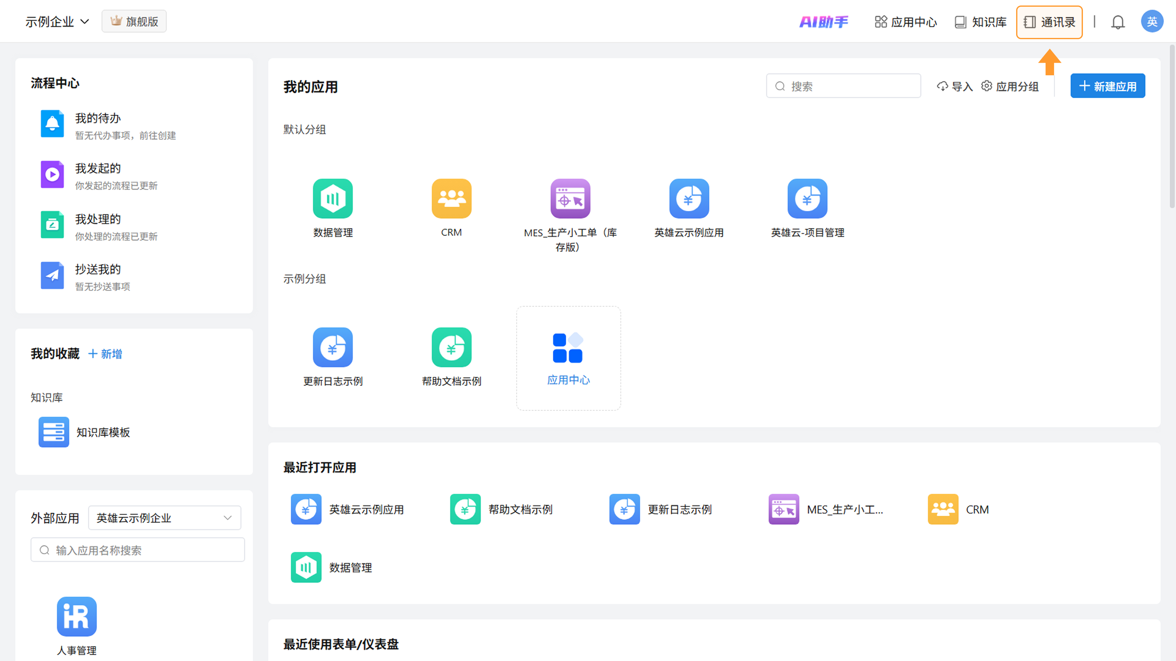 英雄云支持企业自定义工作台内容,可添加多种组件;各组件的添加方式、功能概述,详见:自定义工作台。
