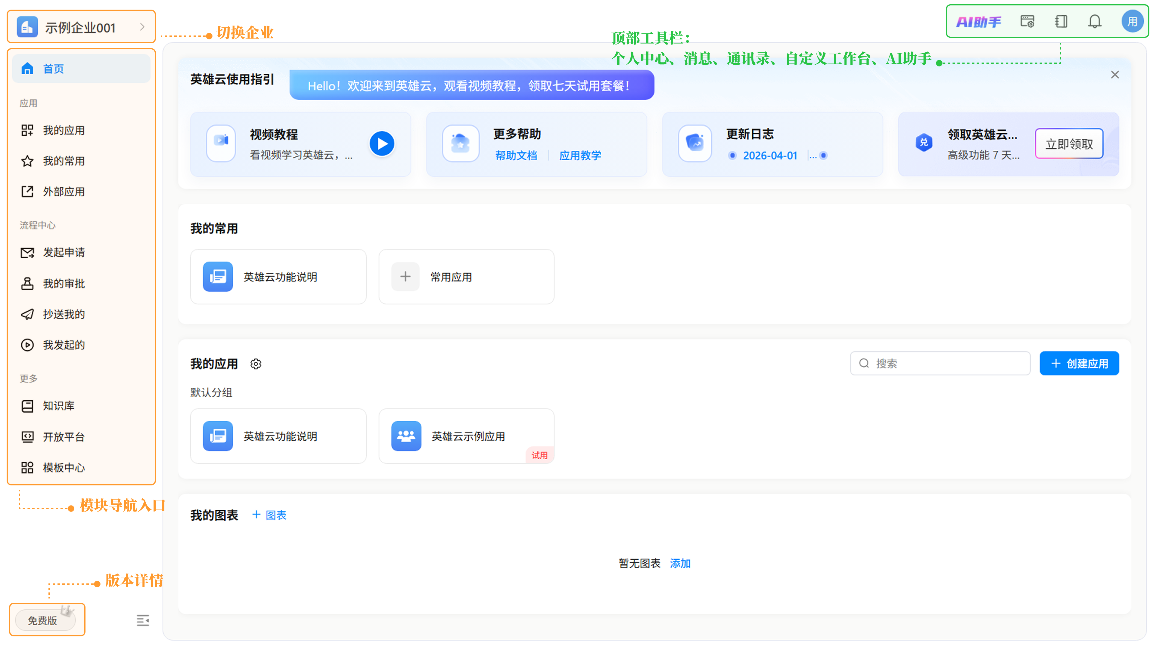 英雄云工作台是为您量身打造的一站式高效办公门户,由 “左侧导航栏”、“顶部工具栏” 与 “工作台组件” 构成。通过将应用管理、流程处理与资源中心深度整合,您可以直观管理高频业务,实时追踪审批进度,并快速调用丰富的行业模板与功能插件。