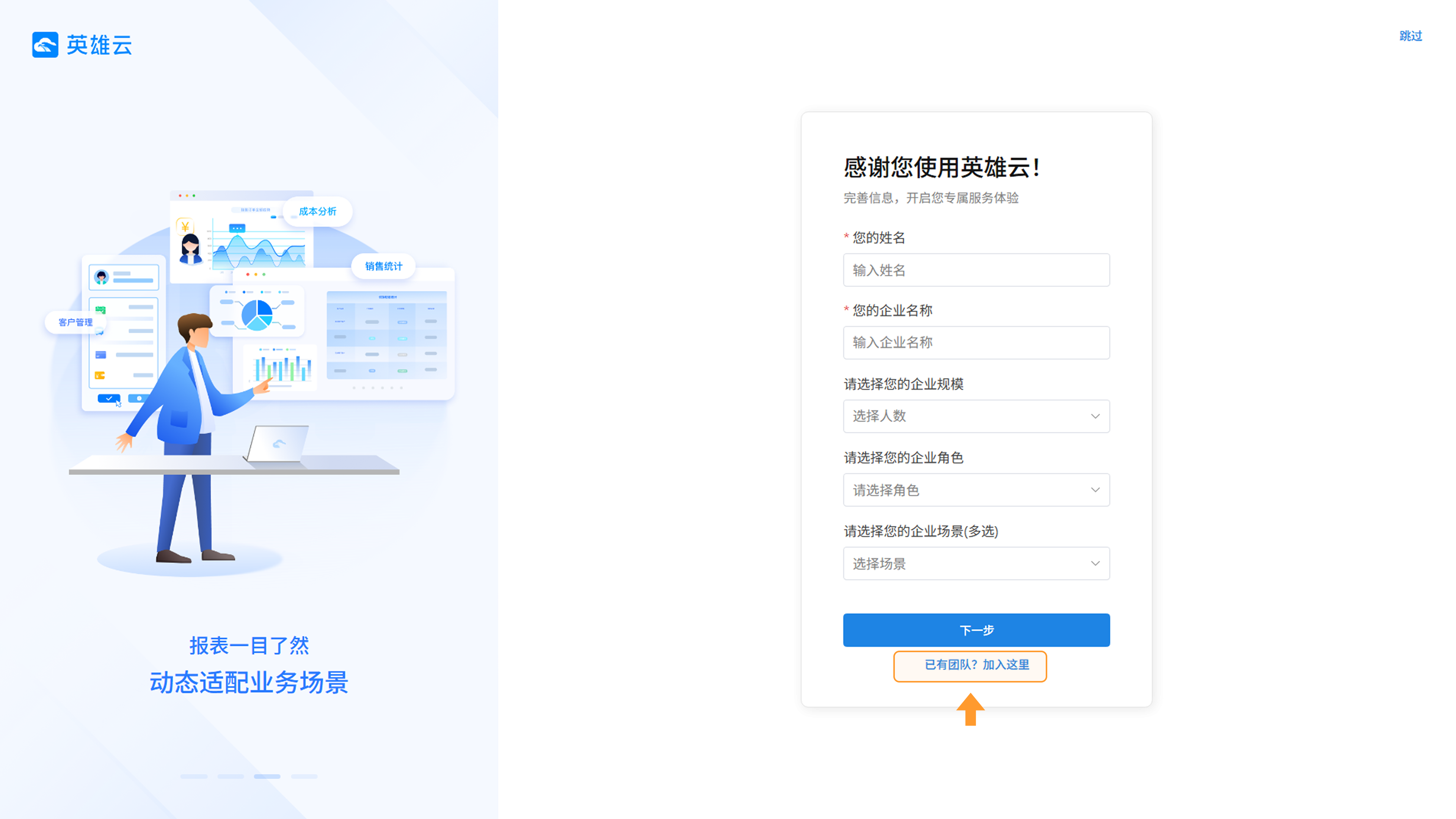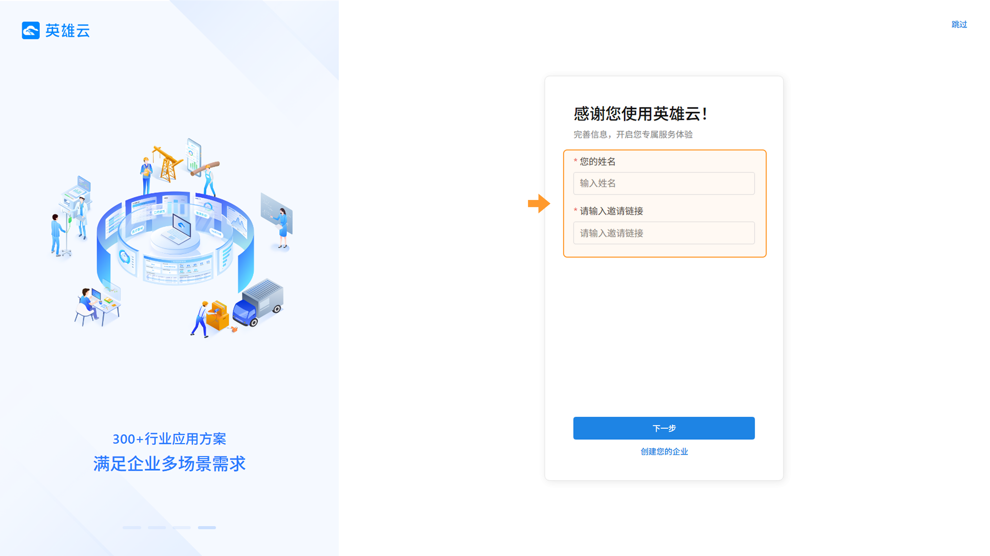 在注册验证后的初始页面,点击「已有团队?加入这里」,切换至加入企业页面,录入您的姓名和邀请链接。
