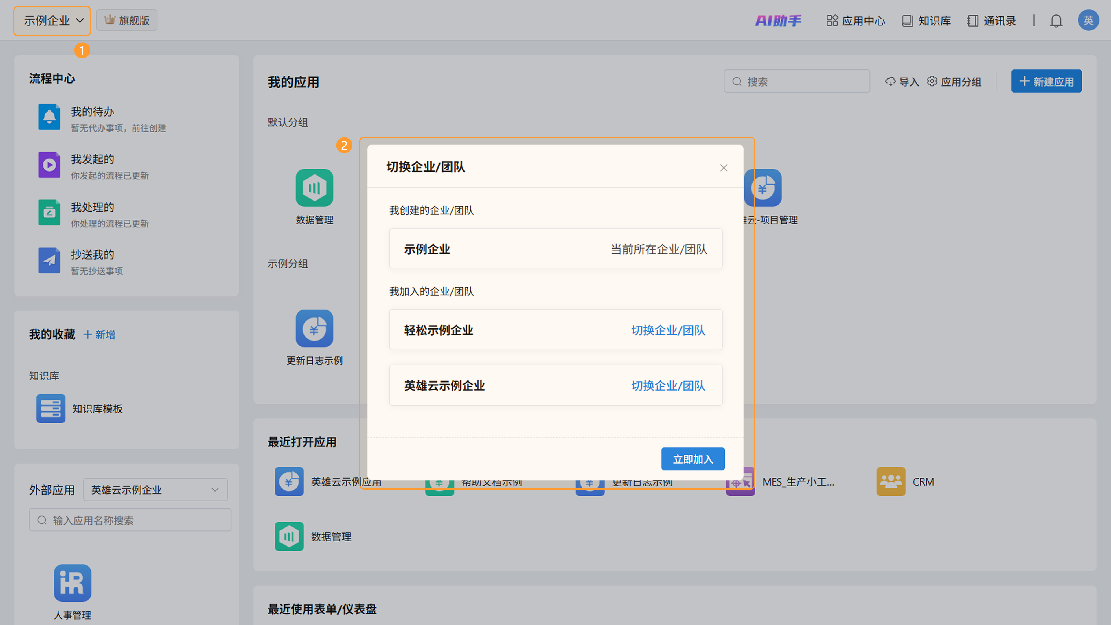 操作路径:点击工作台左上角企业名称 >> 选择目标组织