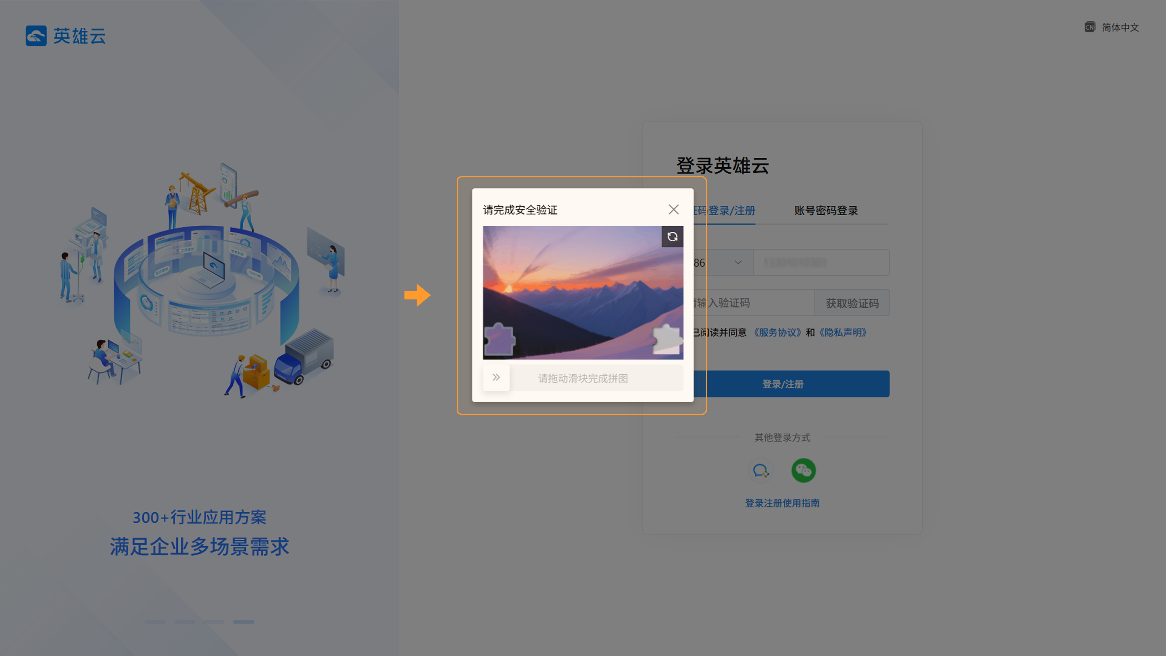 用户需先完成账号注册方可使用英雄云平台服务;已注册用户可直接通过多种方式登录系统。