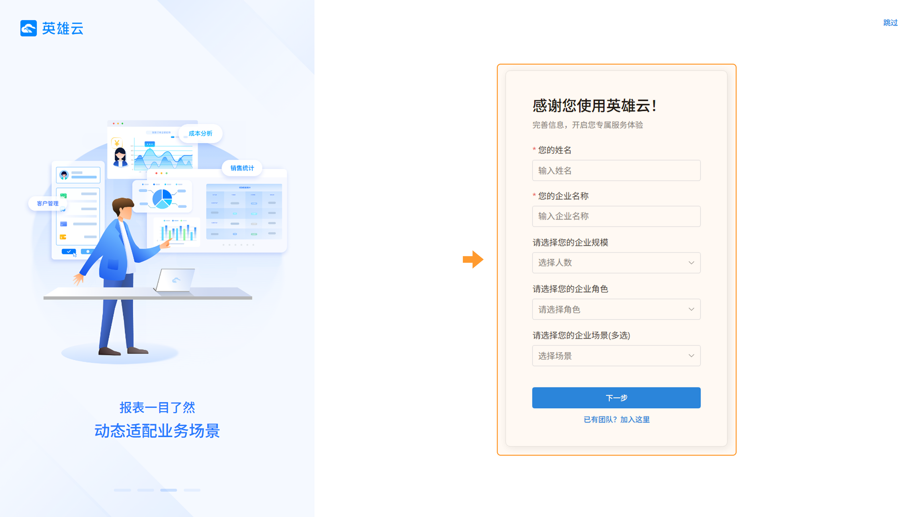 验证成功后,用户会进入创建企业流程,补充企业信息(您的姓名、企业名称、企业规模等)后点击「下一步」按钮。