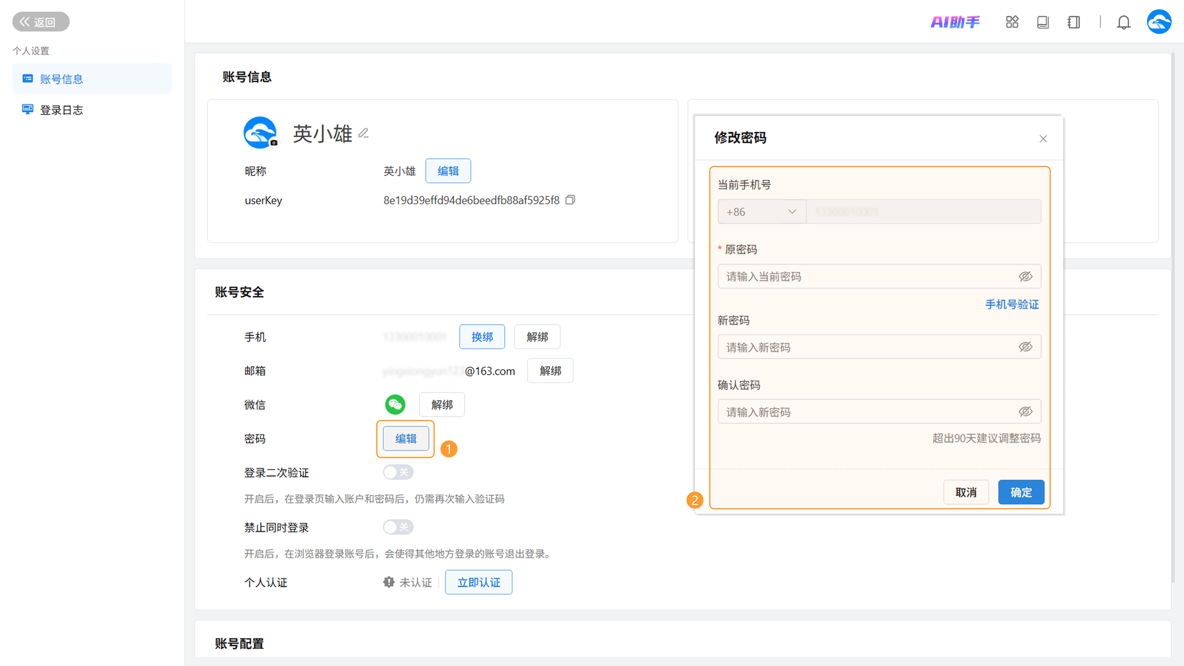点击「编辑」按钮,在弹窗中输入原密码进行验证,设置新密码并提交,修改成功后将自动跳转至登录页。