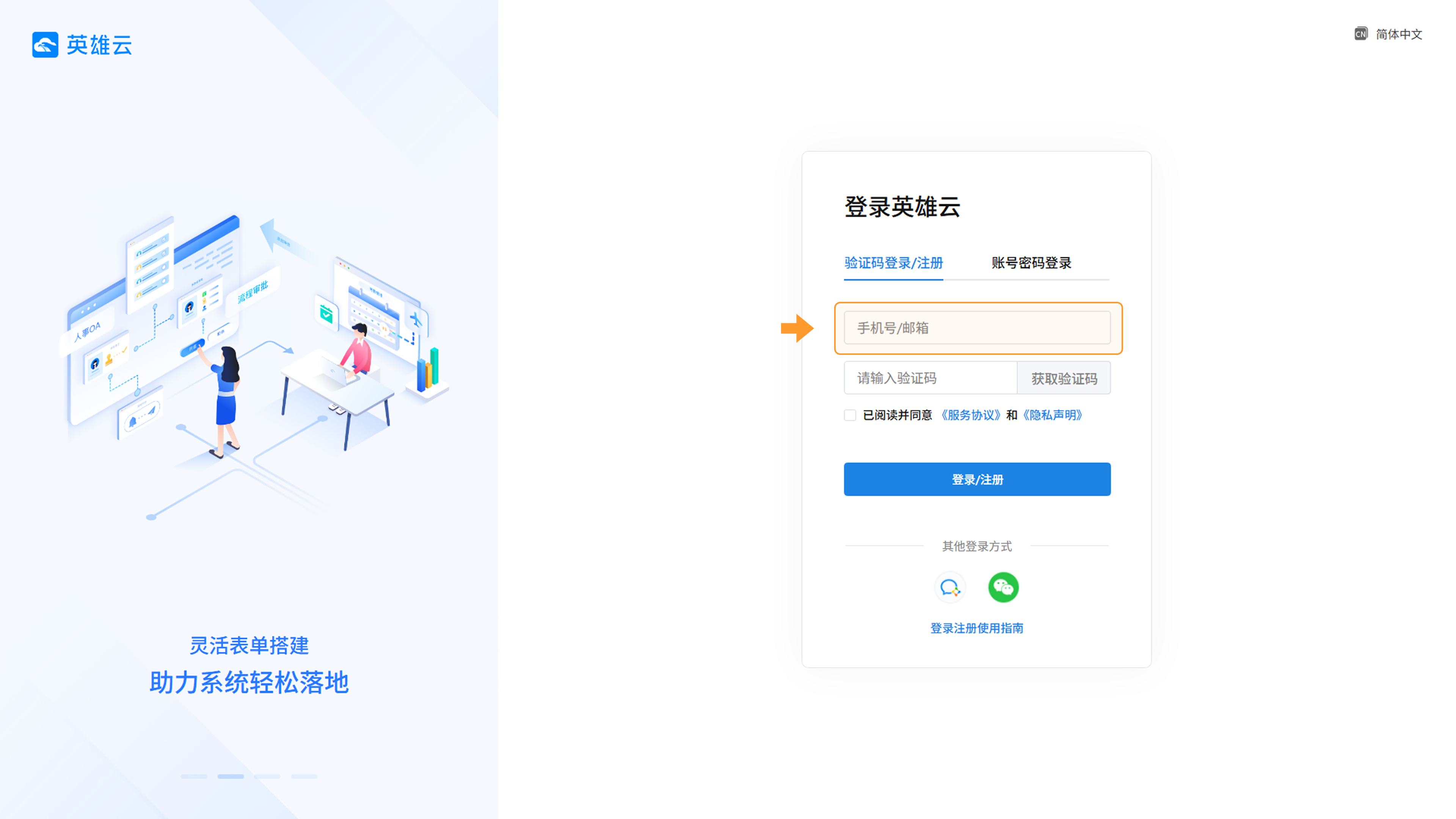 注册英雄云账号后,可以直接使用账号(手机号码或邮箱号码)进行登录,也可以微信扫码或企业微信登录(绑定方式详见:绑定微信、企业微信 ISV 集成)。