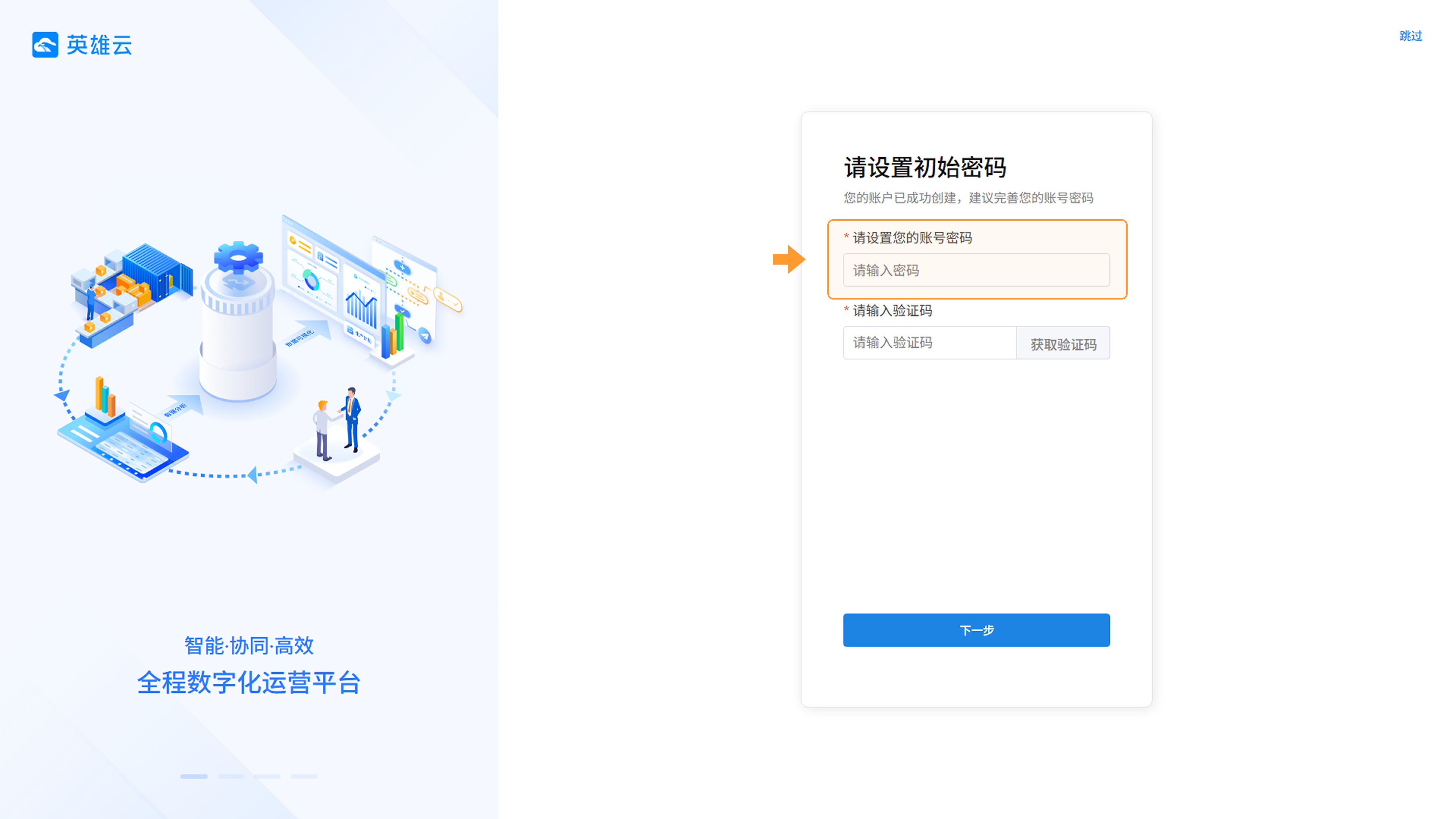 企业信息录入后,用户进入设置初始密码页面。密码的要求是8-30位,包含大小写字母和数字,支持特殊符号。设置密码并完成验证后,点击「下一步」登录英雄云平台。
